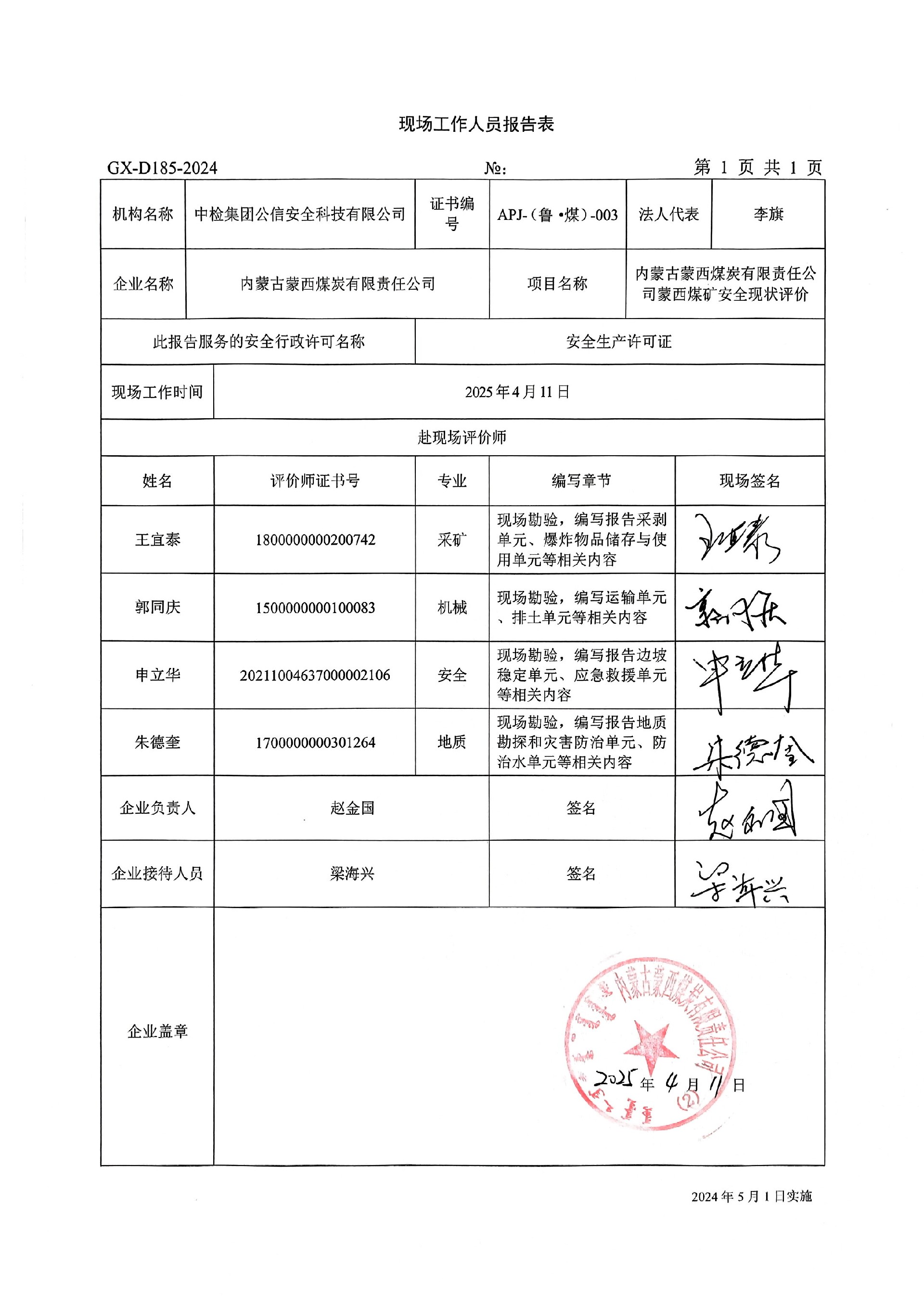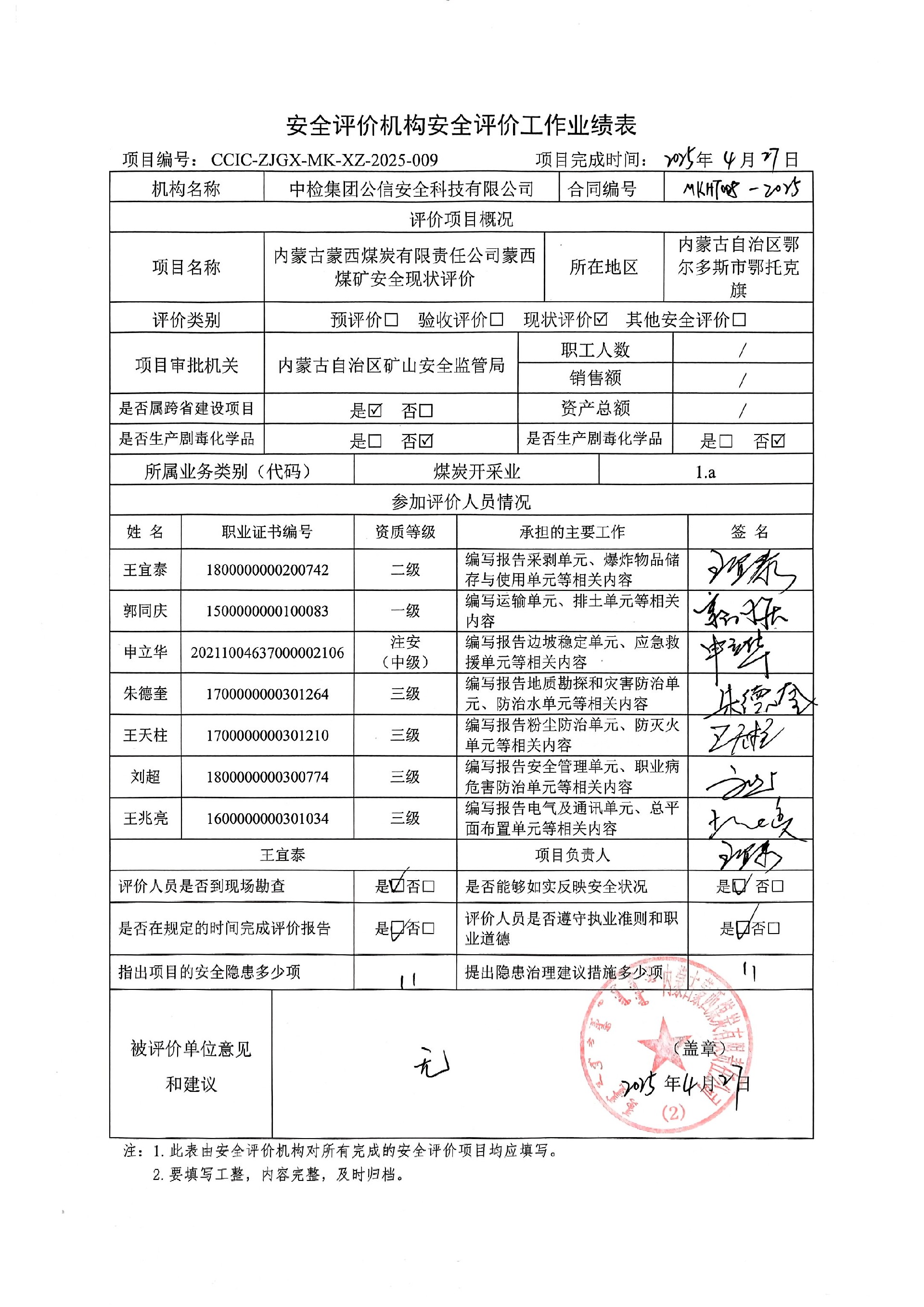 到現(xiàn)場開展安全評價工作的人員、時間及主要任務(wù): 人員:王宜泰、郭同慶、朱德奎、申立華 時間、任務(wù): 評價項(xiàng)目組于2025年4月11日到現(xiàn)場調(diào)查;2025年4月14日編寫修改完善報告。 | ||||||