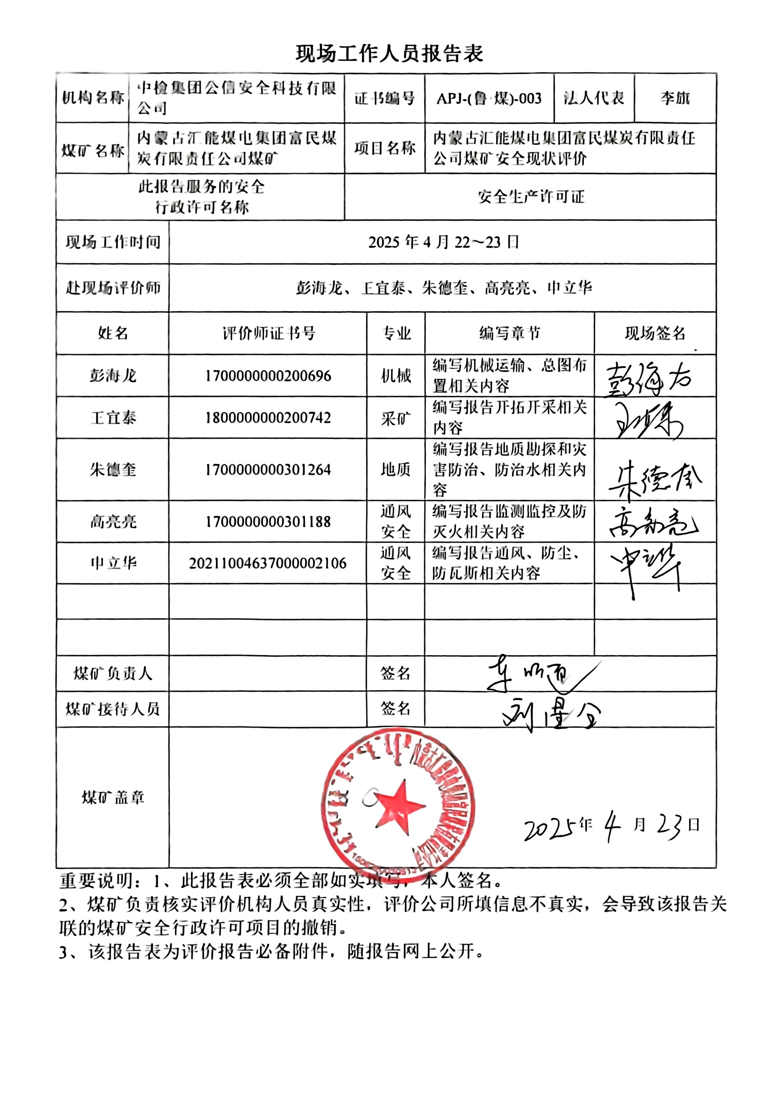 彭海龍 高亮亮 申立華 朱德奎 王宜泰2025422~23到現(xiàn)場(chǎng)進(jìn)行調(diào)查、搜集資料,進(jìn)行現(xiàn)場(chǎng)評(píng)價(jià)