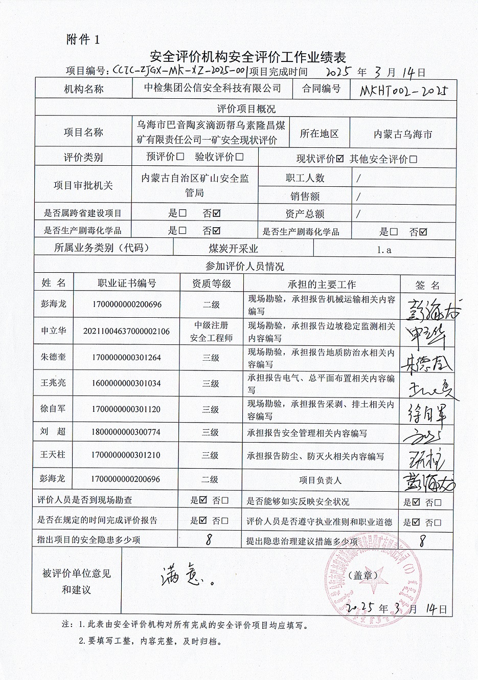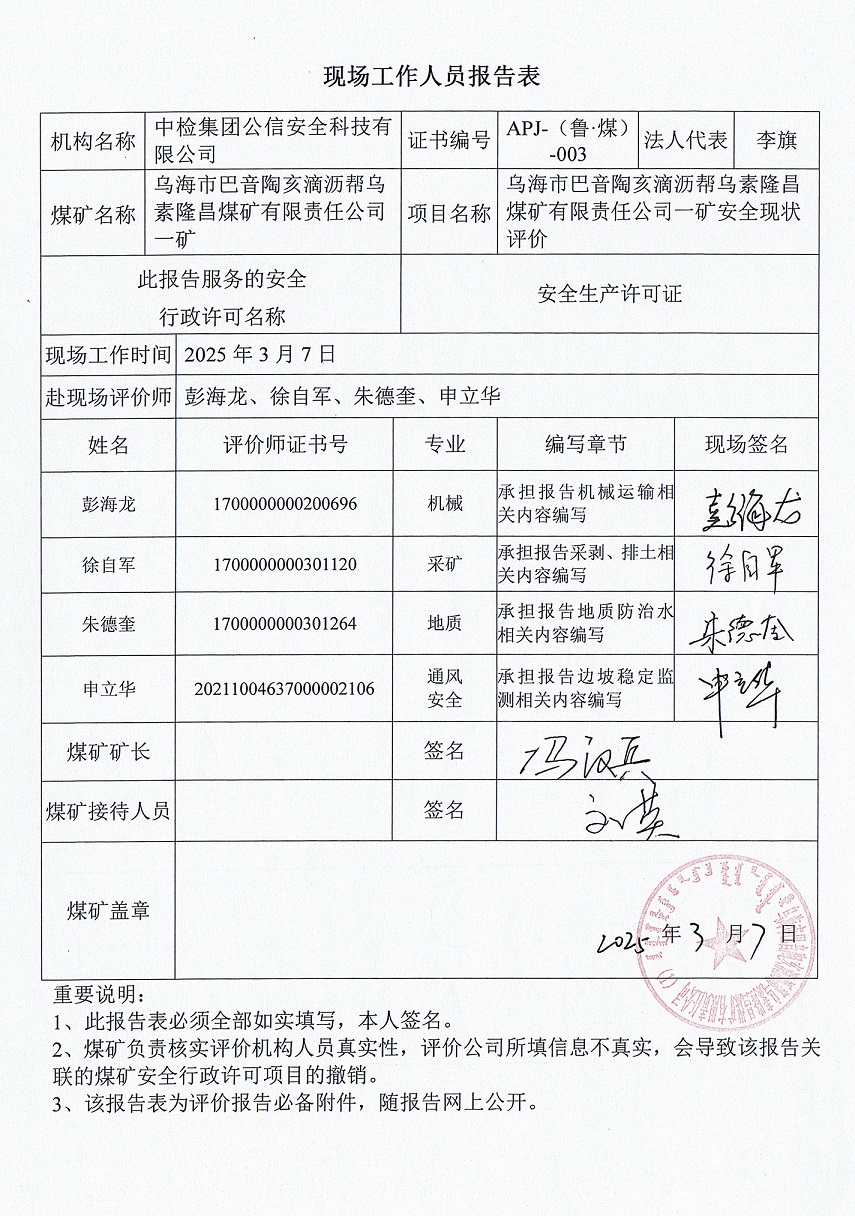 2025415日,烏海市應急管理局組織專家對隆昌煤礦進行了安全生產(chǎn)許可證發(fā)證現(xiàn)場核查,按照核查要求對報告內(nèi)容進行了修改,出具此版烏海市巴音陶亥滴瀝幫烏素隆昌煤礦有限責任公司一礦安全現(xiàn)狀評價報告》。