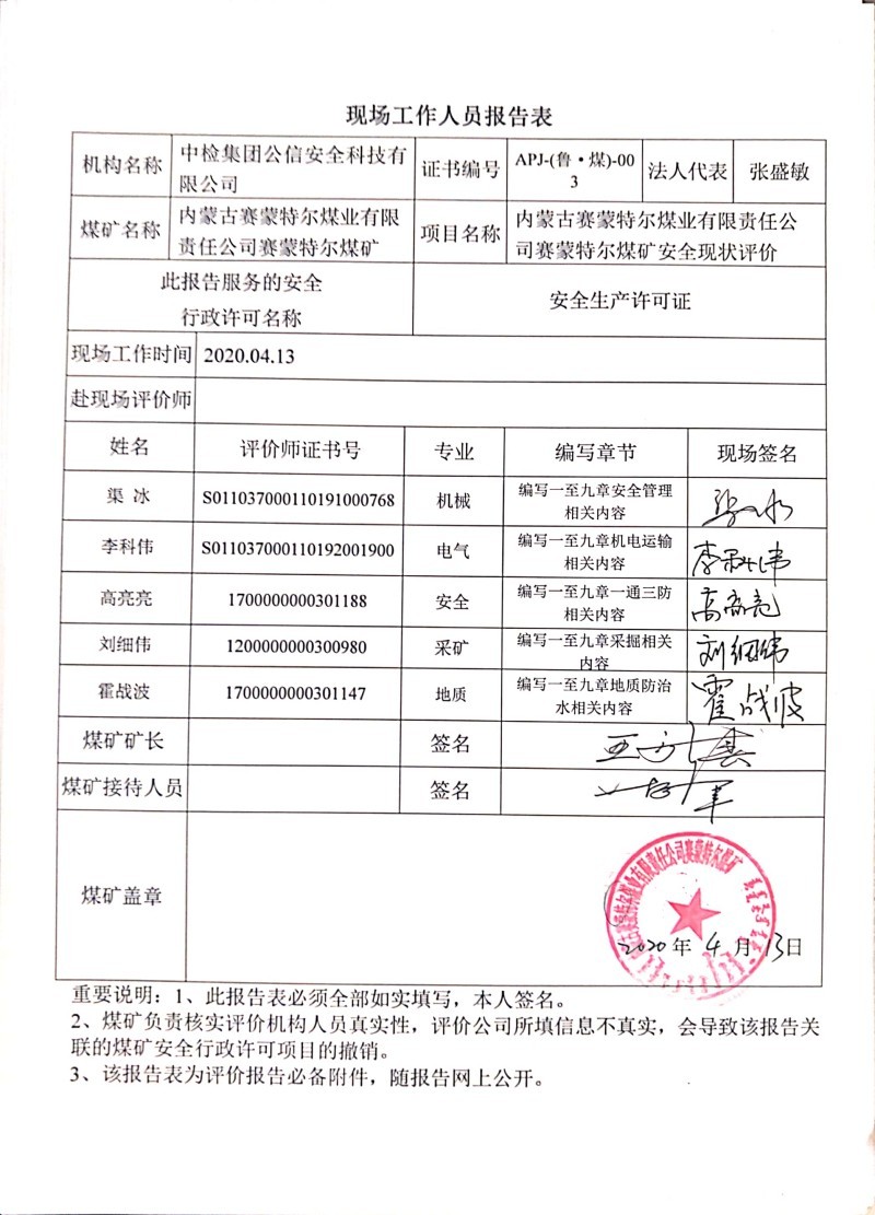 2020年第3季度1.內(nèi)蒙古賽蒙特爾煤業(yè)有限責(zé)任公司賽蒙特爾煤礦安全現(xiàn)狀評價