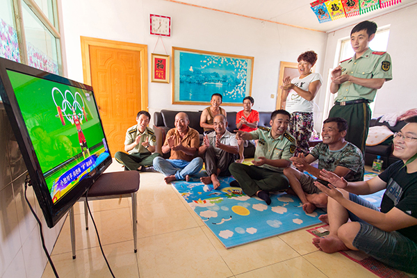 官兵和外來務(wù)工人員一起觀看奧運賽事
