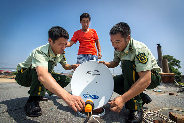 官兵在安裝調(diào)試衛(wèi)星電視裝置