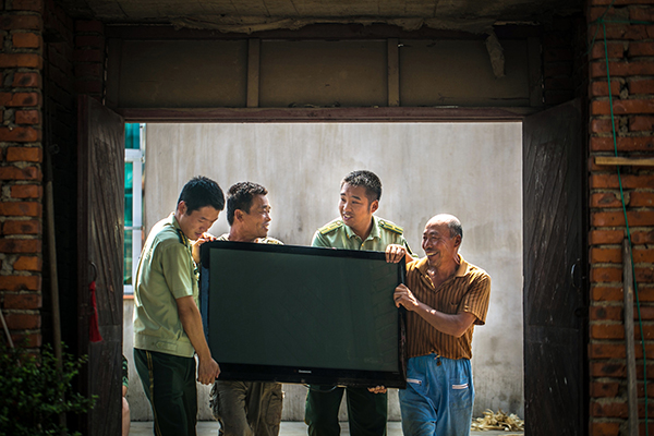 官兵為外來務(wù)工人員搬來電視機