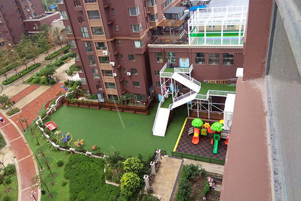 谷先生:大概是今年四五月份吧,事先我們不知道這個事。而且這個操場很快就建成了,鋪草坪最多也就兩天。它所占的地方是1號樓和3號樓中間的夾角,原來是綠化帶,現(xiàn)在已經(jīng)變成幼兒園的小操場,你看還搭建了消防梯。