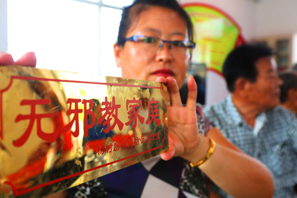 8月17日,大連市普蘭店區(qū)楊樹(shù)房街道村民向記者展示無(wú)邪教家庭門(mén)牌