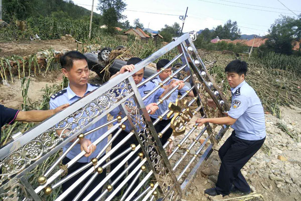 8月8日,岫巖滿族自治縣公安局前營子派出所民警在前營子鎮(zhèn)新屯村幫助群眾災(zāi)后重建