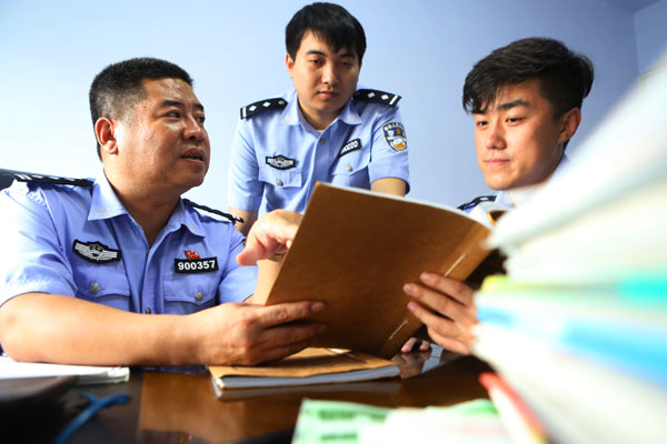 9月4日,盤錦市公安局刑偵支隊(duì)副支隊(duì)長(zhǎng)趙光(左一)在與同事研究案情