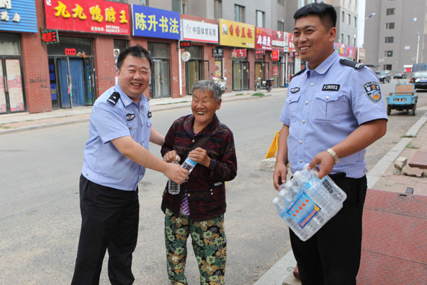 9月14日,營(yíng)口經(jīng)濟(jì)技術(shù)開(kāi)發(fā)區(qū)公安局宋屯新區(qū)治安辦主任金憲寬(左)帶領(lǐng)民警一起為群眾發(fā)放礦泉水