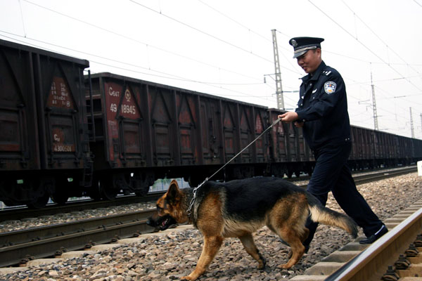 9月20日,沈陽鐵路公安處沈陽站民警攜警犬在轄區(qū)鐵路線路巡查護路