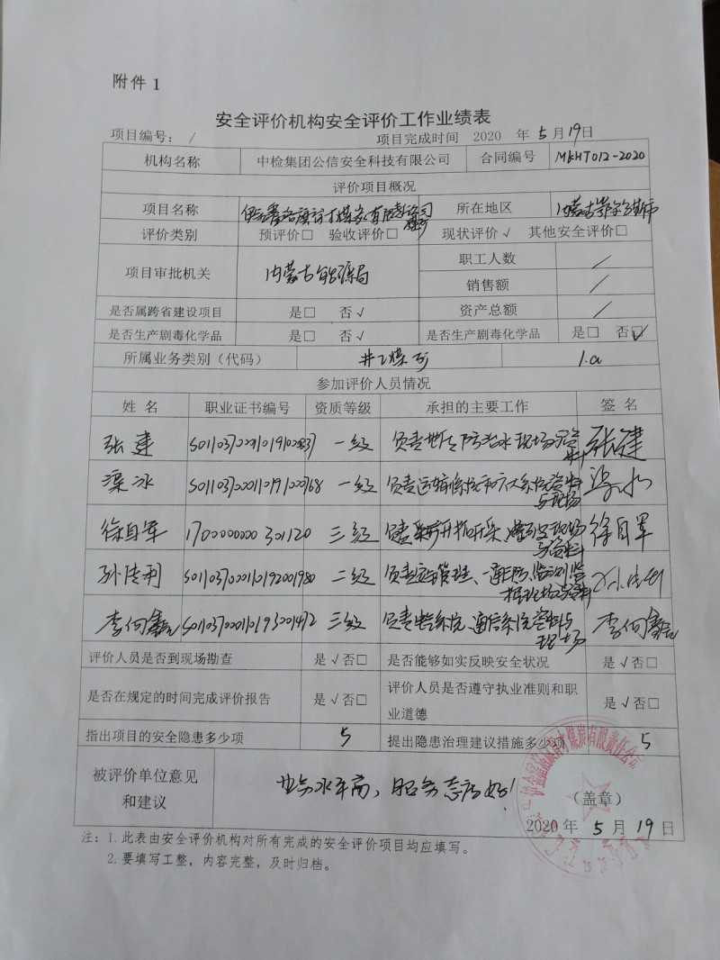 | 現(xiàn)場開展安全評價工作的人員、時間及主要任務: 孫傳利 張 建 渠 冰 徐自軍 李向鑫 于2020年4月15~16日到現(xiàn)場進行調(diào)查、搜集資料,進行現(xiàn)場評價。 于2020年5月13日到現(xiàn)場對評價時存在的問題進行了復查。 |