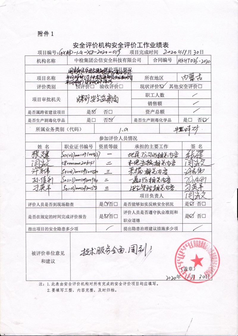 | 現(xiàn)場開展安全評價工作的人員、時間及主要任務(wù): 張建、閆運文、孫傳利、許光偉、刁英平于2020年10月10日到現(xiàn)場進行調(diào)查、搜集資料,進行現(xiàn)場評價。 |