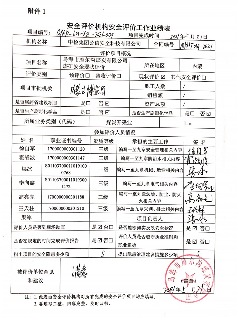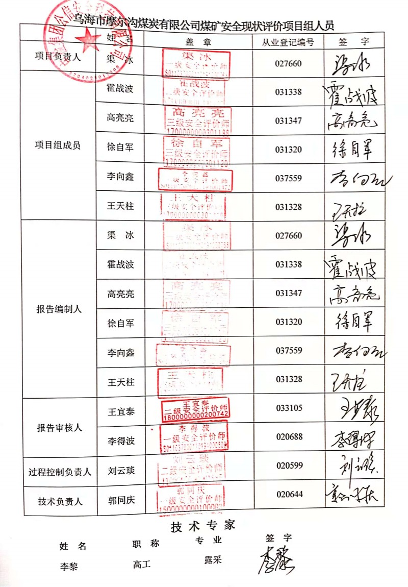 | 評價項目名稱 | 烏海市摩爾溝煤炭有限公司煤礦安全現(xiàn)狀評價報告 | ||||||