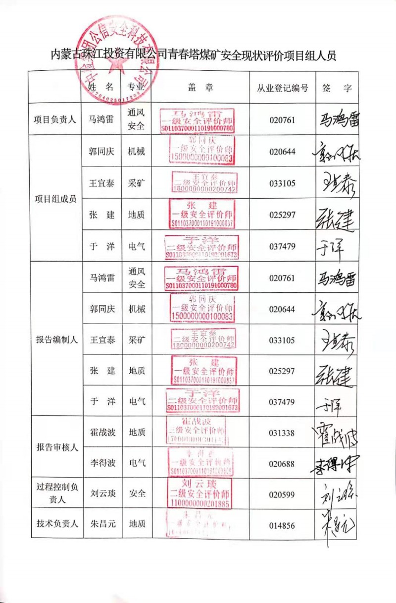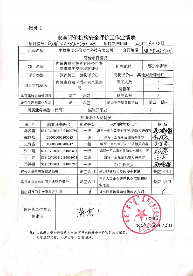 | 評價項目名稱 | 內(nèi)蒙古珠江投資有限公司青春塔煤礦安全現(xiàn)狀評價報告 | ||||||