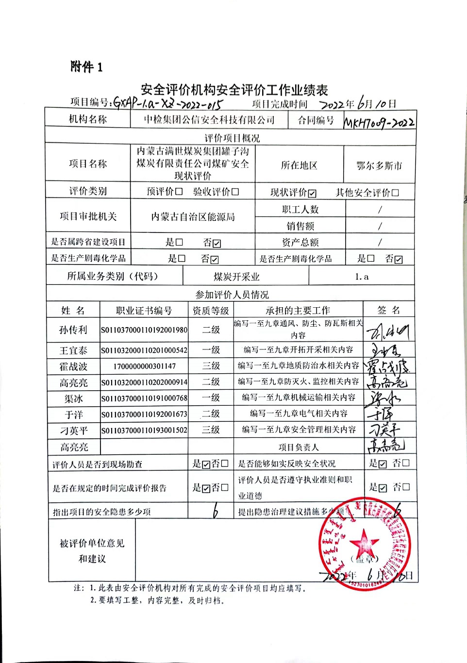 | 評價項目名稱 | 內(nèi)蒙古滿世煤炭集團罐子溝煤炭有限責(zé)任公司煤礦安全現(xiàn)狀評價報告 | ||||||